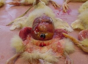 Un’elevata mortalità in pulcini appena accasati deve far sospettare onfalite. I pulcini morti vanno incontro a decomposizione nel giro di poche ore, e presentano un forte odore. All’esame autoptico, rimuovendo la pelle dell’addome si può notare un arrossamento a livello dell’ombelico del pulcino (onfalo). Il sacco vitellino si presenta ingrossato e di colore alterato.